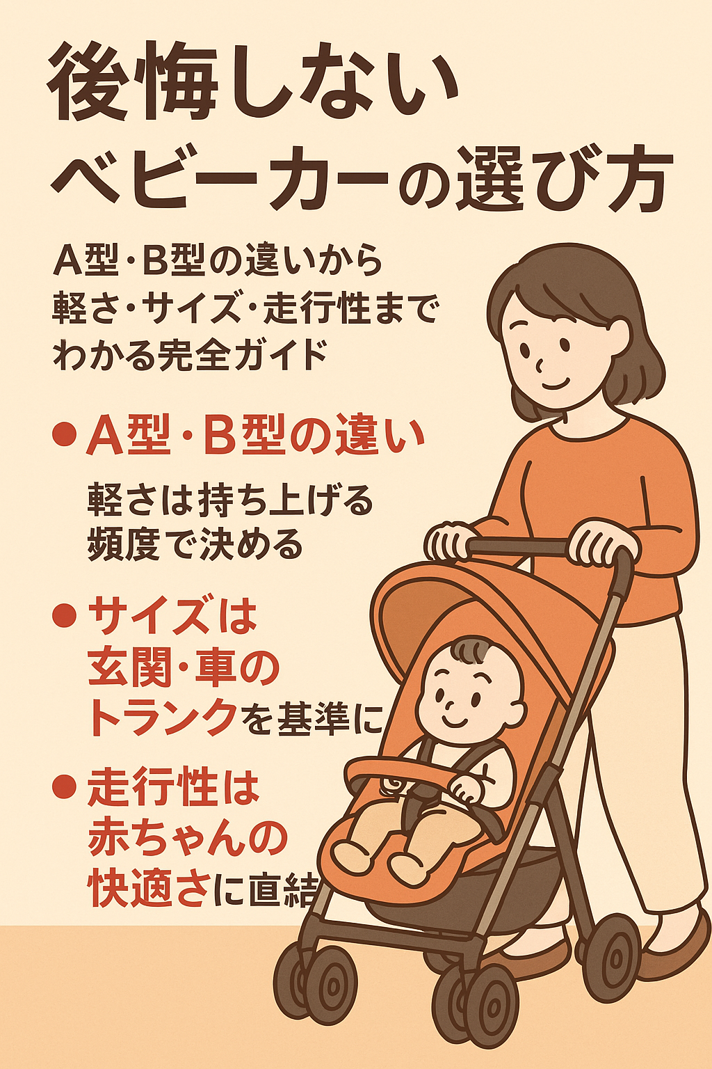 0歳児との外出が増えると、「扱いやすさ」と「赤ちゃんの快適さ」の両立がとても大事になります。ここでは、A型・B型の違いを含め、ベビーカー選びのポイントを分かりやすくまとめました。